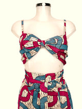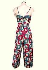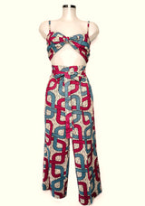 Trousers and top set. Trousers with pockets and fastening strap. Top with adjustable straps and fastening at the back.