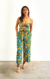 Trousers and top set. Trousers with pockets and fastening strap. Top with adjustable straps and fastening at the back.
